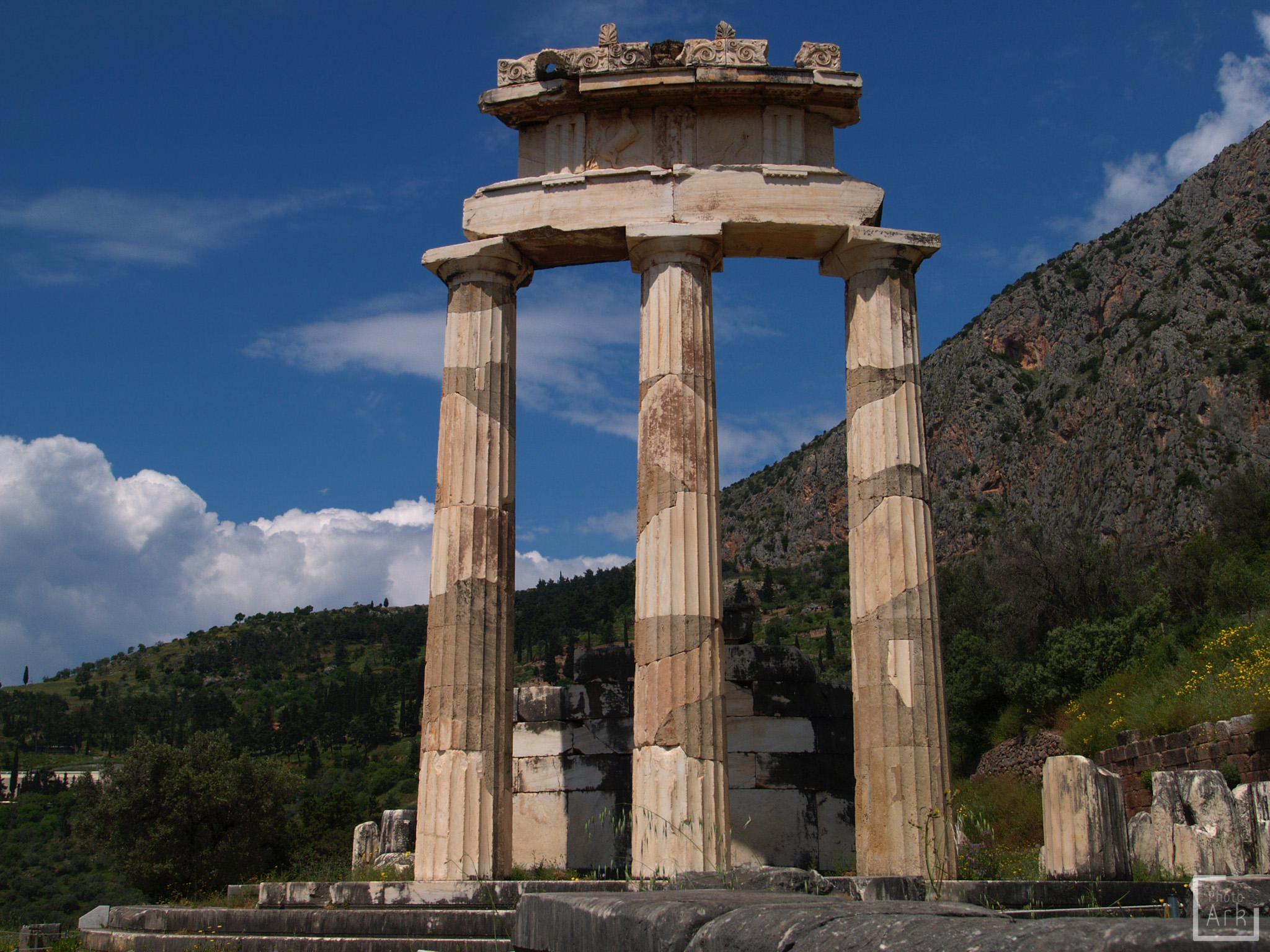 Delphi…a mysterious and spectacular sanctuary located high on the flanks of Mount Parnassus in Central Greece. Known in ancient times as the Omphalos (navel of the world) and sacred to the god Apollo, it was a place of pilgrimage for royalty, politicians and commanders requiring prophetic insight into what the future held. The ambiguity of the Oracle’s responses propelled armies to their glory or doom, and warring city states built glorious treasuries housing spoils of war and offerings to the powerful son of Zeus and Leto.